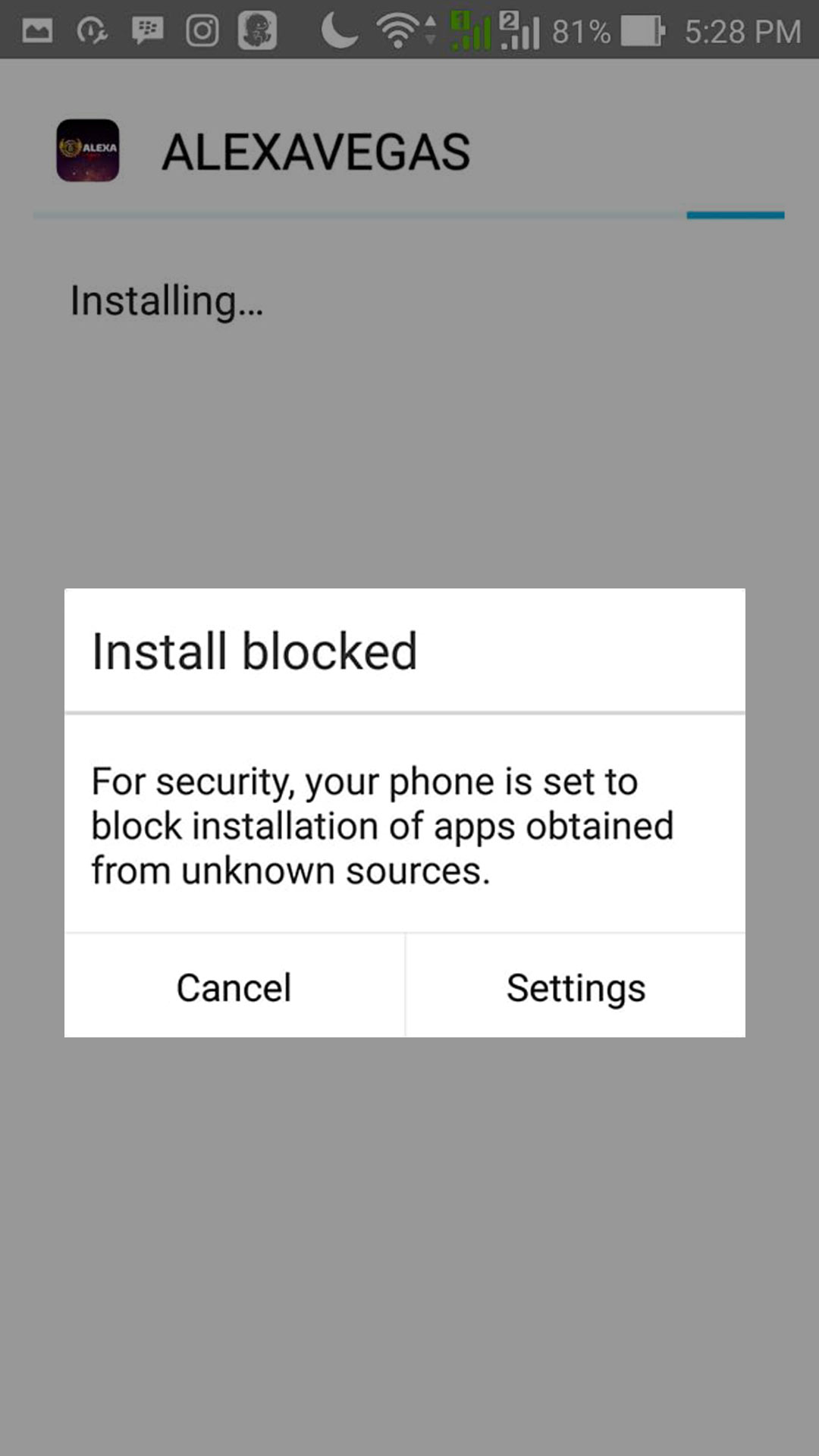 Jika sudah selesai, klik dan install langsung file Alexavegas.apk, jika muncul keterangan Install Blocked, Pilih dan Klik “Settings”, setelah itu pilih “ Unknown Source” di bagian “ Security”, Centang/Klik pada bagian seperti yang dilingkari pada gambar dibawah ini.